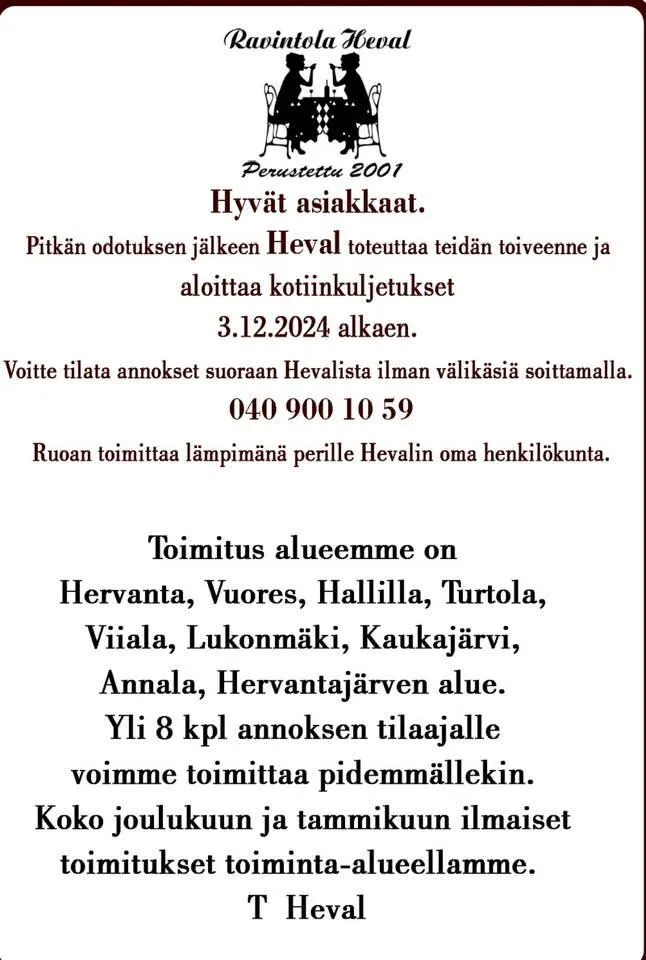 Huomio! Suosittelemme tilaamaan kotiinkuljetuksen 1h-1.5h etukäteen, etenkin lounas ja ruuhka-aikaan.